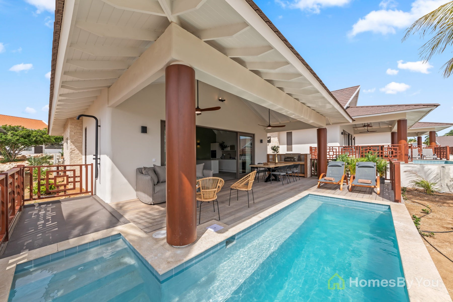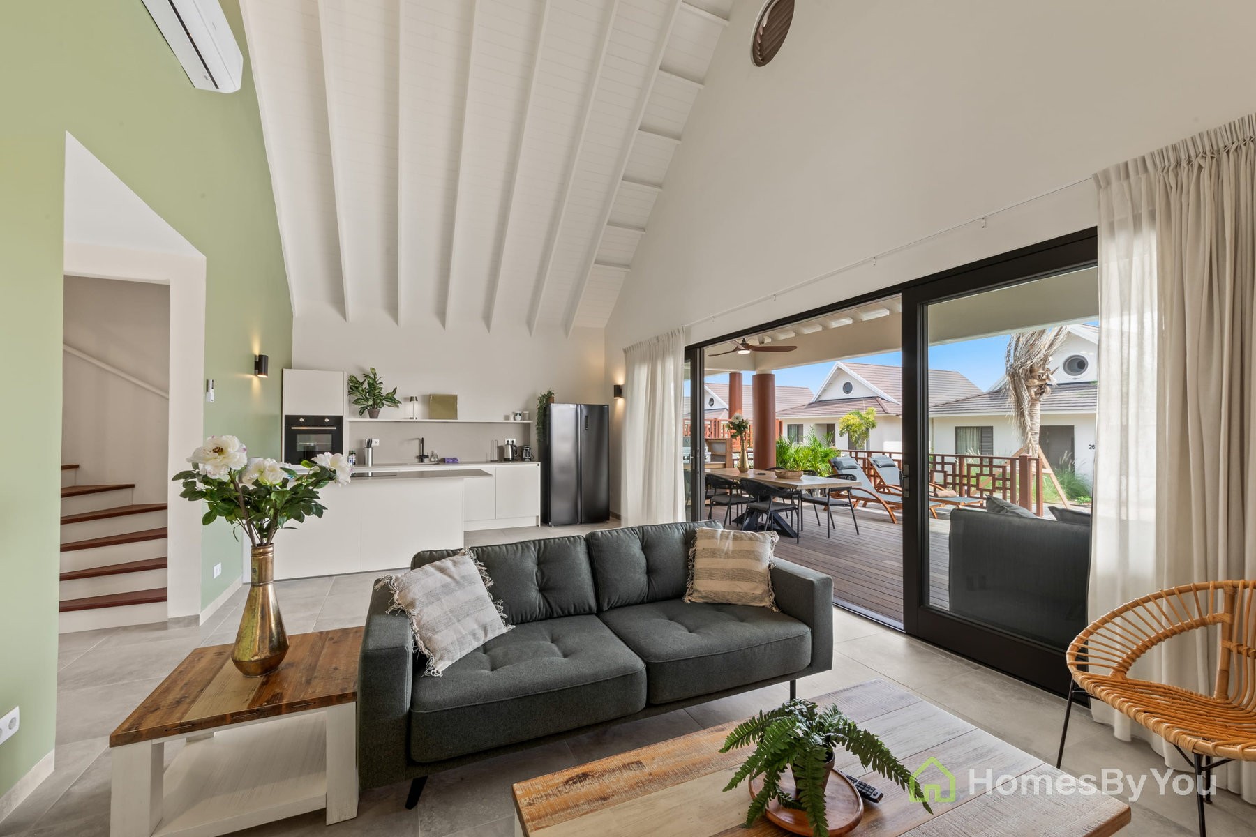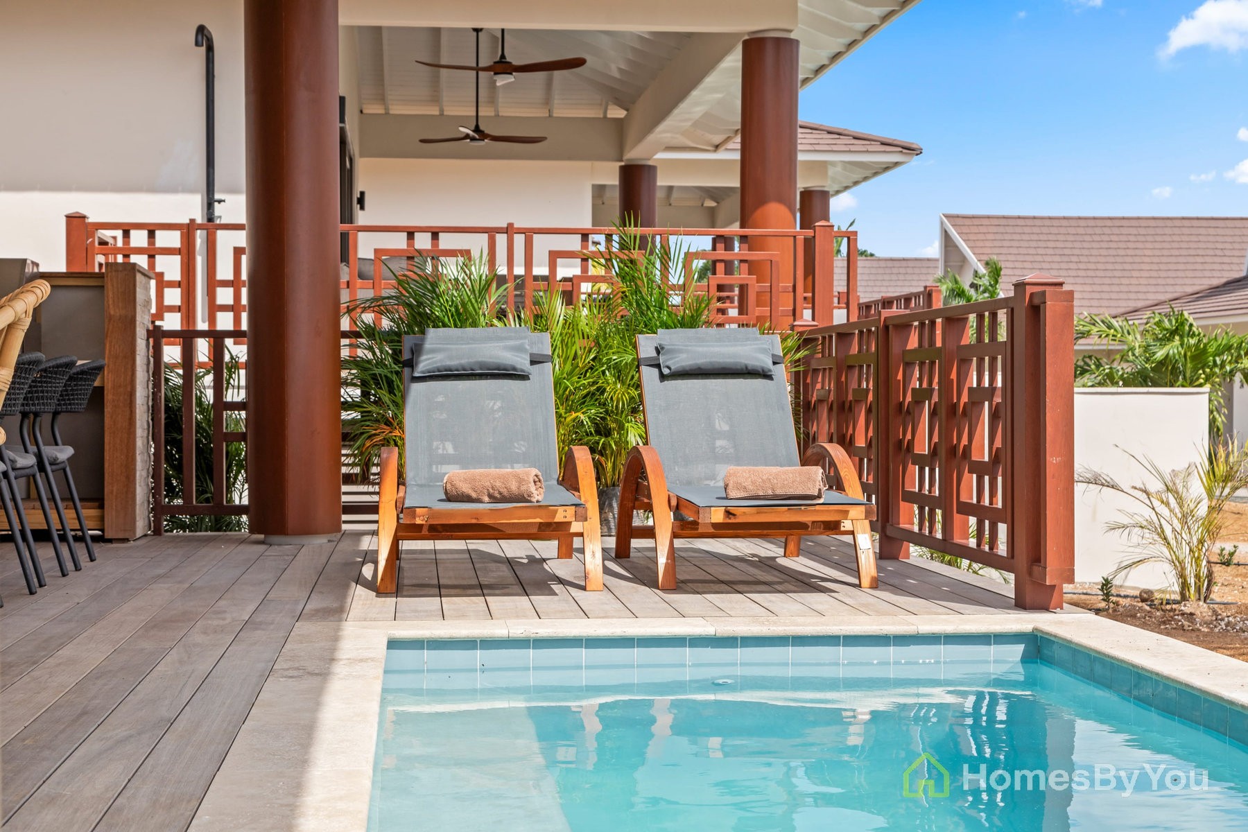 De villa is ontworpen met oog voor comfort en het Caribische buitenleven. De ruime open woonkamer met grote schuifdeuren zorgt voor een naadloze overgang tussen binnen en buiten. Vanuit de leefruimte loopt u direct het terras op met privézwembad en zonneterras, gelegen aan het groen van de golfbaan. Hier geniet u in alle rust van privacy, zon en uitzicht.